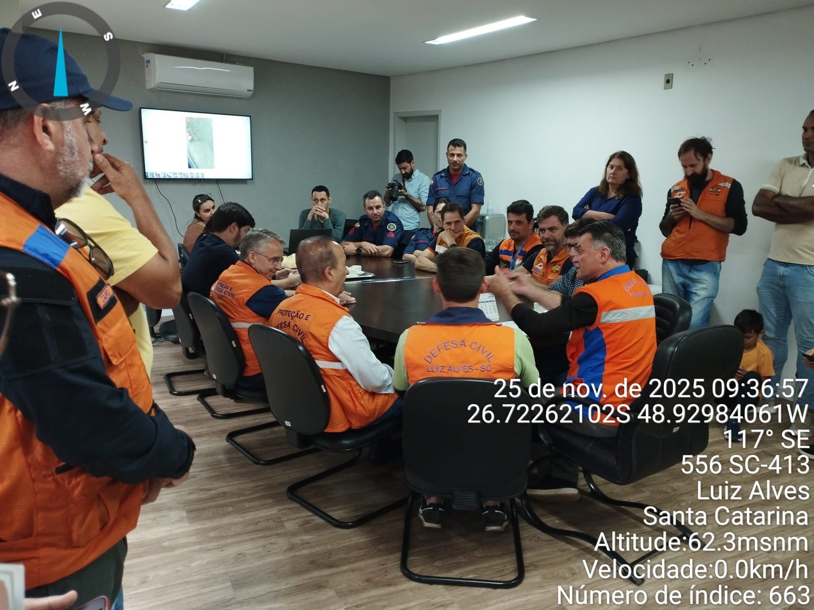 A equipe de Itapema também participou de uma reunião de alinhamento com o governador do Estado, o secretário estadual de Proteção e Defesa Civil, representantes da Defesa Civil de Luiz Alves, forças de segurança e demais órgãos de apoio. O encontro tratou das necessidades imediatas, das estratégias de atendimento à população, das ações emergenciais em andamento e das medidas para restabelecer os serviços essenciais.