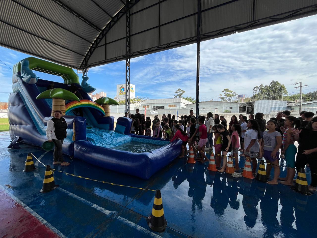 A Escola Cívico-Militar Maria Linhares de Souza viveu um dia de muita alegria e integração nesta quarta-feira (8). Como parte da programação da Semana da Criança, a unidade promoveu uma série de atividades recreativas que transformaram o pátio em um verdadeiro espaço de diversão, com escorregadores aquáticos, pula-pulas e jogos de mesa.