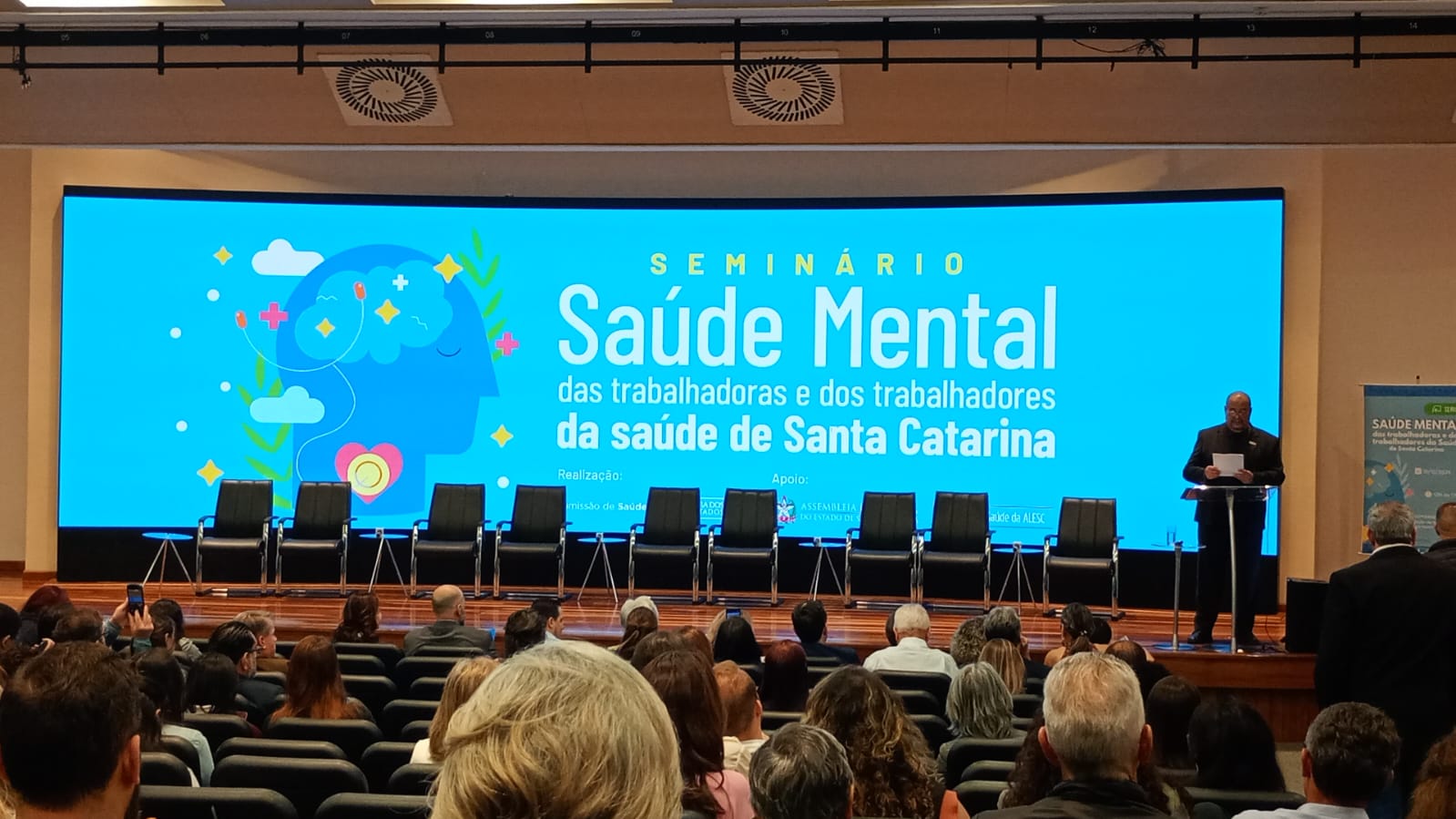 A equipe do Programa de Saúde do Trabalhador (PST) representou Itapema no Seminário Saúde Mental das Trabalhadoras e dos Trabalhadores da Saúde de Santa Catarina, realizado nesta segunda-feira (01/12) na Assembleia Legislativa. O encontro reuniu representantes do Governo Federal, parlamentares catarinenses e profissionais de todas as regiões do Estado para discutir políticas de cuidado, valorização e melhoria das condições de trabalho na área da saúde.